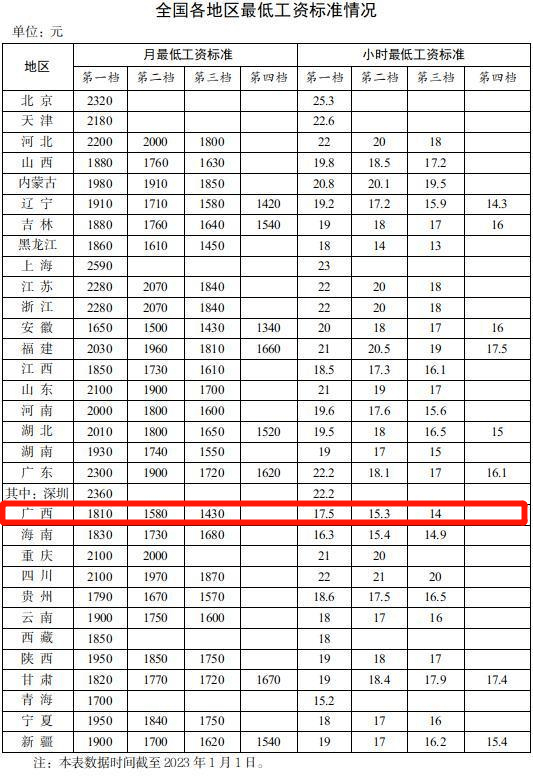 全国各地区最低工资标准情况(截至2023年1月1日),来自人社部网站