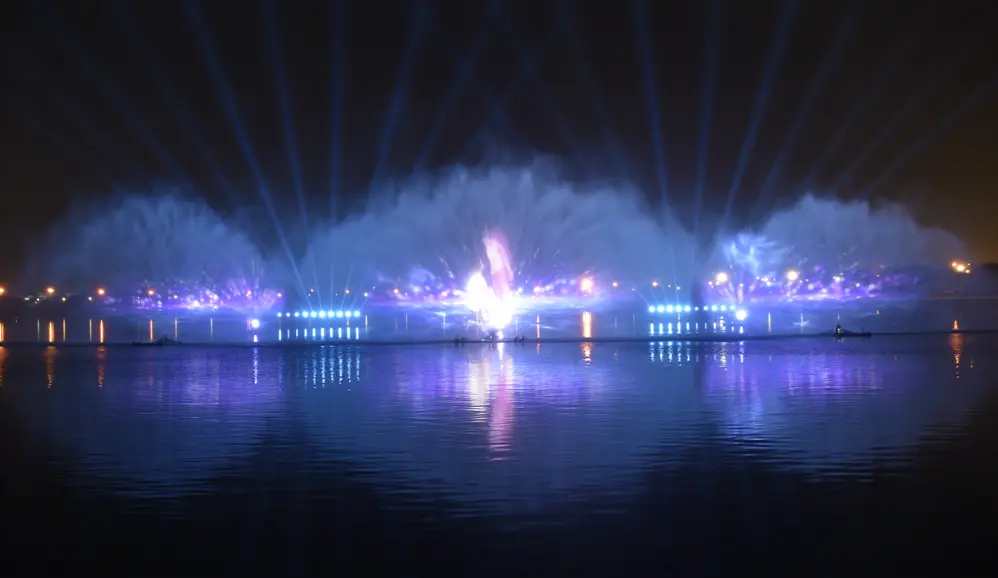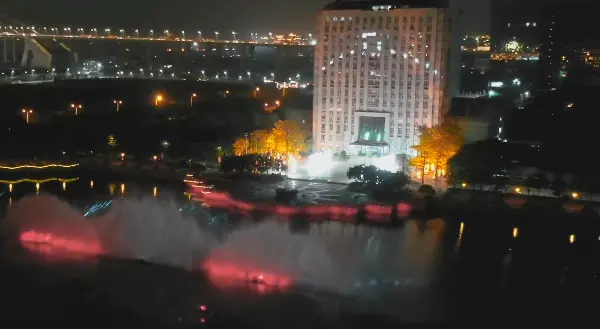 沙田大型光影水幕秀是一部以天为幕、以水为台,以多媒体视觉内容为画笔,大型水幕为载体,集音乐、舞蹈、投影、灯光秀、激光等多种艺术手法与现代科技相结合的大型原创光影水幕秀。水幕秀场地位于沙田服务大楼广场大水域,背靠珠江入海口,江面横宽200米,深300米,三组扇形水幕跨度100米,高15米。