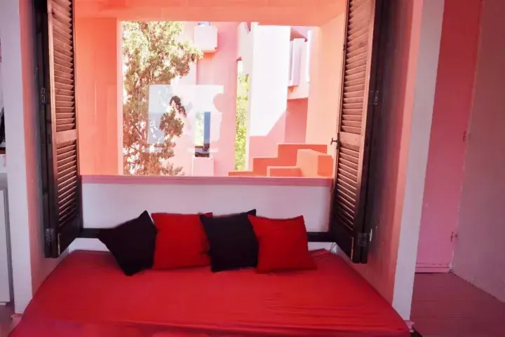 红墙是一家房地产商的名为La Manzanera的民用住宅开发项目,由建筑师Ricardo Bofill设计的。他受到北非阿拉伯军事堡垒的启发,借鉴了它的互锁楼梯等建筑结构,再加上与周边自然环境相得益彰的鲜艳配色,设计出了卡尔佩的红墙这个建筑。其中共有三种房型:60平方米的工作室、80平方米的带有卧室的公寓(就是Pp这次住的)、120平方米的带有卧室的公寓。另外,建筑师Ricardo Bofill还设计了公寓里的屋顶天台、游泳池、桑拿房等,希望以此来提高居民的生活水平。