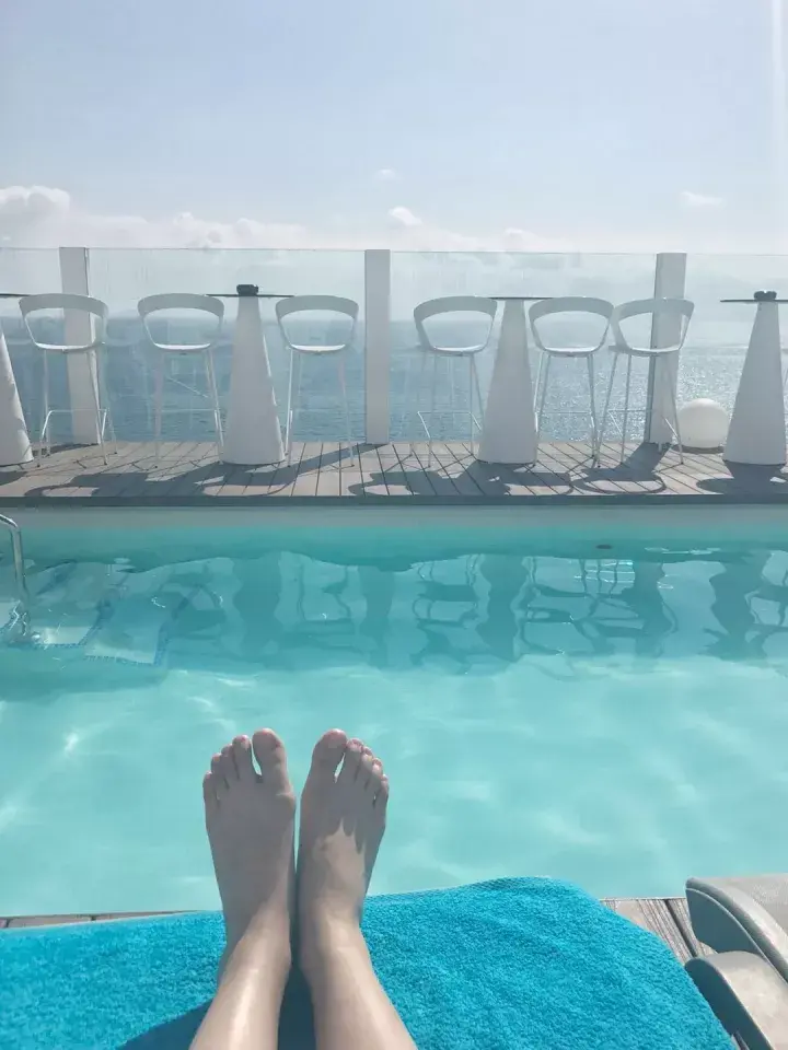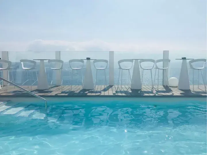 它最有特色的是顶楼的skybar酒吧,一圈围栏是透明的玻璃,上面是蓝色的天空,下面是蓝色的海,景色很棒,旁边还有一个泳池,两排晒太阳的躺椅,非常惬意。