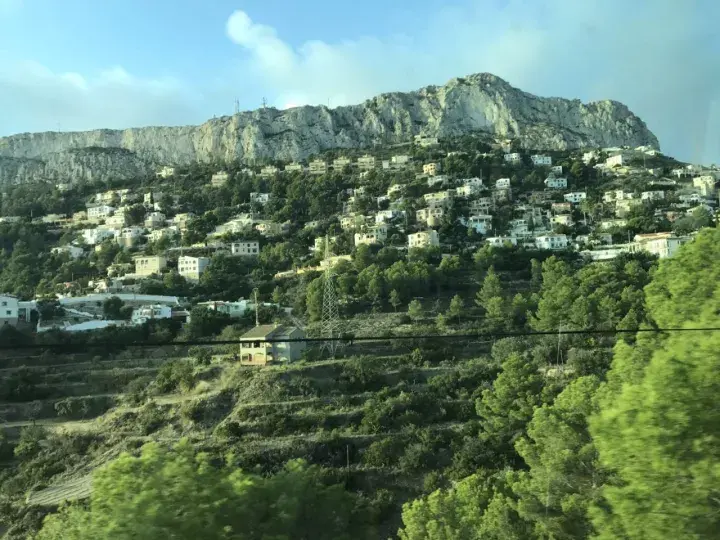 从阿利坎特机场下来坐机场外面alsa公司的大巴可以到达卡尔佩,途径Benidorm换乘一次,40分钟到Benidorm,然后再40分钟到红墙。说起来Benidorm居然是西班牙高楼最密集的城市(西班牙的高楼真的少,连首都马德里真正能称得上摩天大厦的大楼也屈指可数),因为税低,所以有钱人喜欢在这个海边小镇投资房地产。