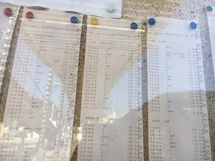 在红墙最后一天甚至还发生了卡尔佩去阿利坎特机场大巴不来的情况,我们八点不到就到了公交车站,结果等了半个多小时,大巴踪影也没大巴见一辆,边上时刻表却分明写着8:05和8:20各有去阿利坎特机场的大巴,仔细一看,最后竟然有一行小字:时刻表会随时发生变化,请咨询售票处。然而,旁边的售票窗口大门紧闭。