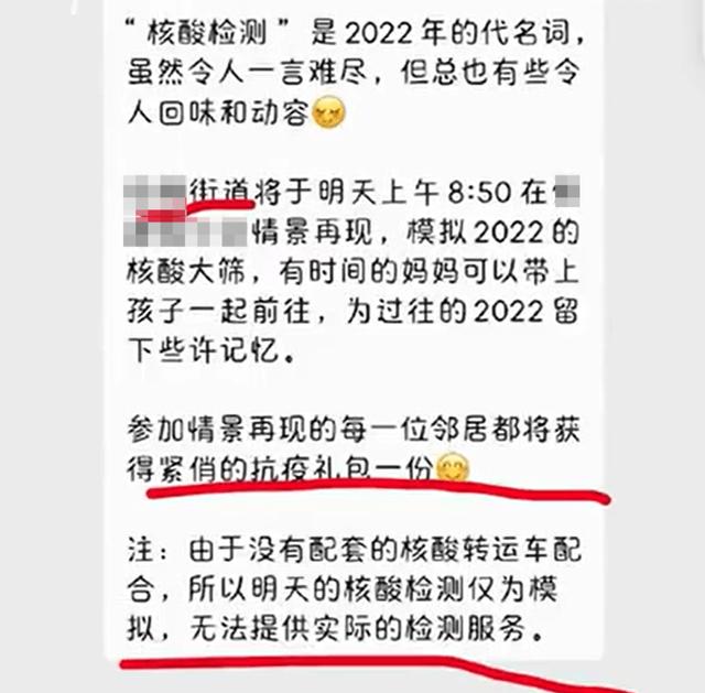 “街道将于明天上午8点50分在某小区情景再现,模拟2022年的核酸大筛,有时间的妈妈可以带上孩子一起前往,为过往的2022年留下些许记忆。参加情景再现的每一位邻居都将获得紧俏的抗疫礼包一份。”