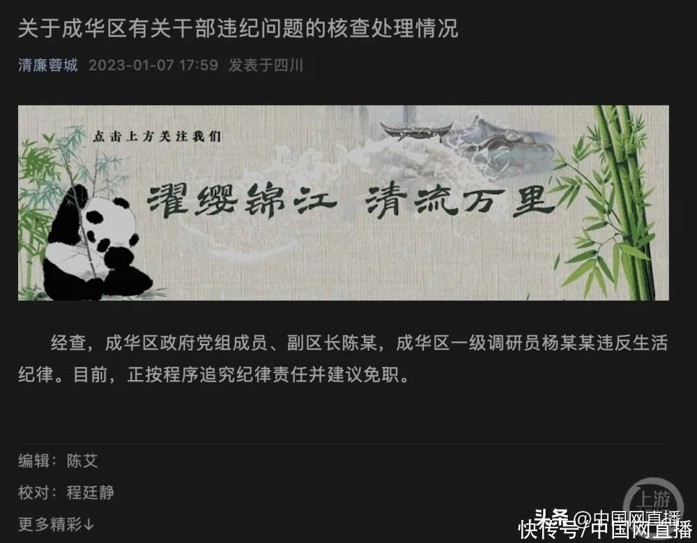 成都市纪委监委最新发布对于此事的处理通报,认定成华区政府党组成员、副区长陈某和成华区一级调研员杨某某违反生活纪律,相关部门目前正按程序,追究纪律责任并建议免职。