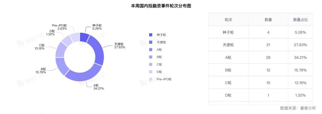 从本周披露获投企业的阶段分布来看,事件主要集中在A轮、天使轮和B轮,分别为A轮26个,天使轮21个,B轮12个。