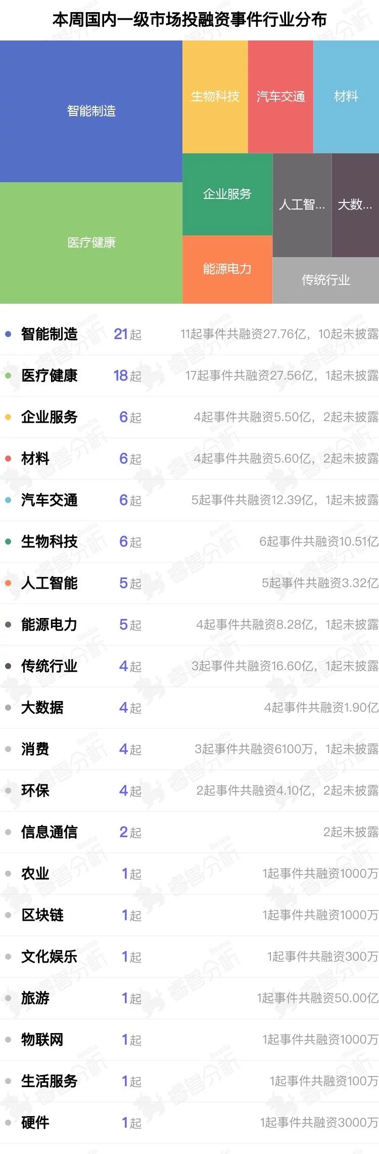 从融资案例数量来看,本周智能制造、医疗健康、企业服务领域融资最活跃,分别为21个、18个、6个。