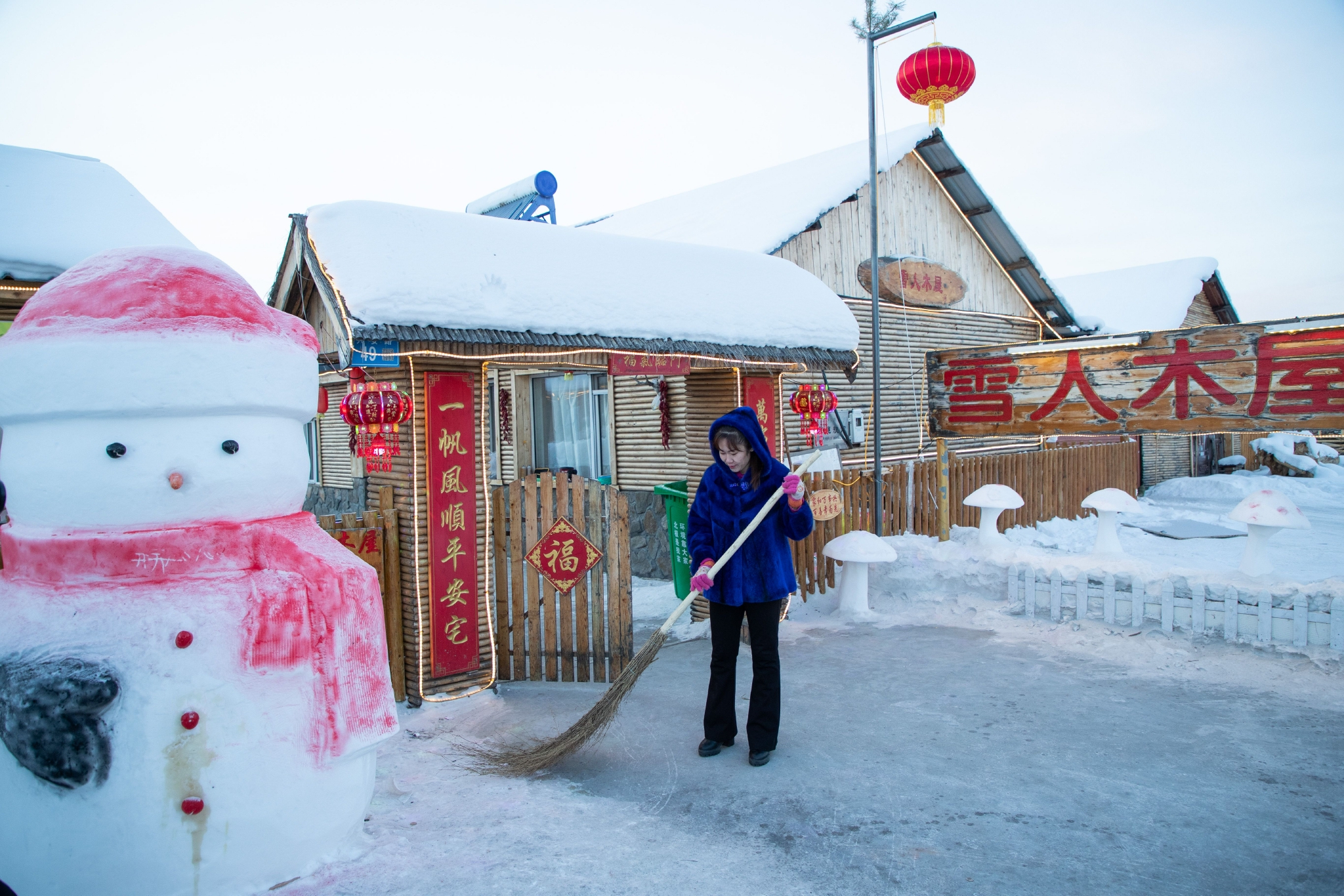 1月7日,漠河市北极村民宿经营者史瑞娟在打扫门前卫生。新华社记者 张涛 摄