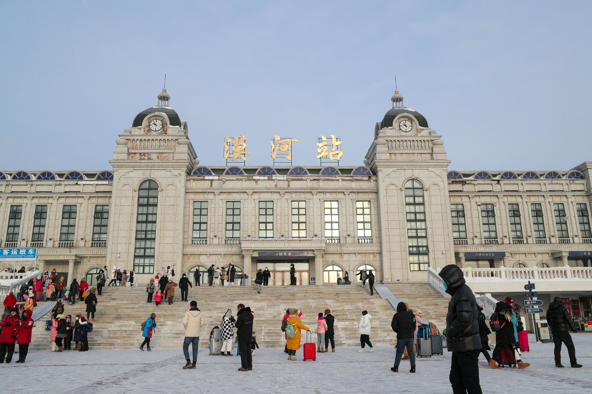 1月7日,出站的游客在漠河火车站外拍照留念。新华社记者 张涛 摄