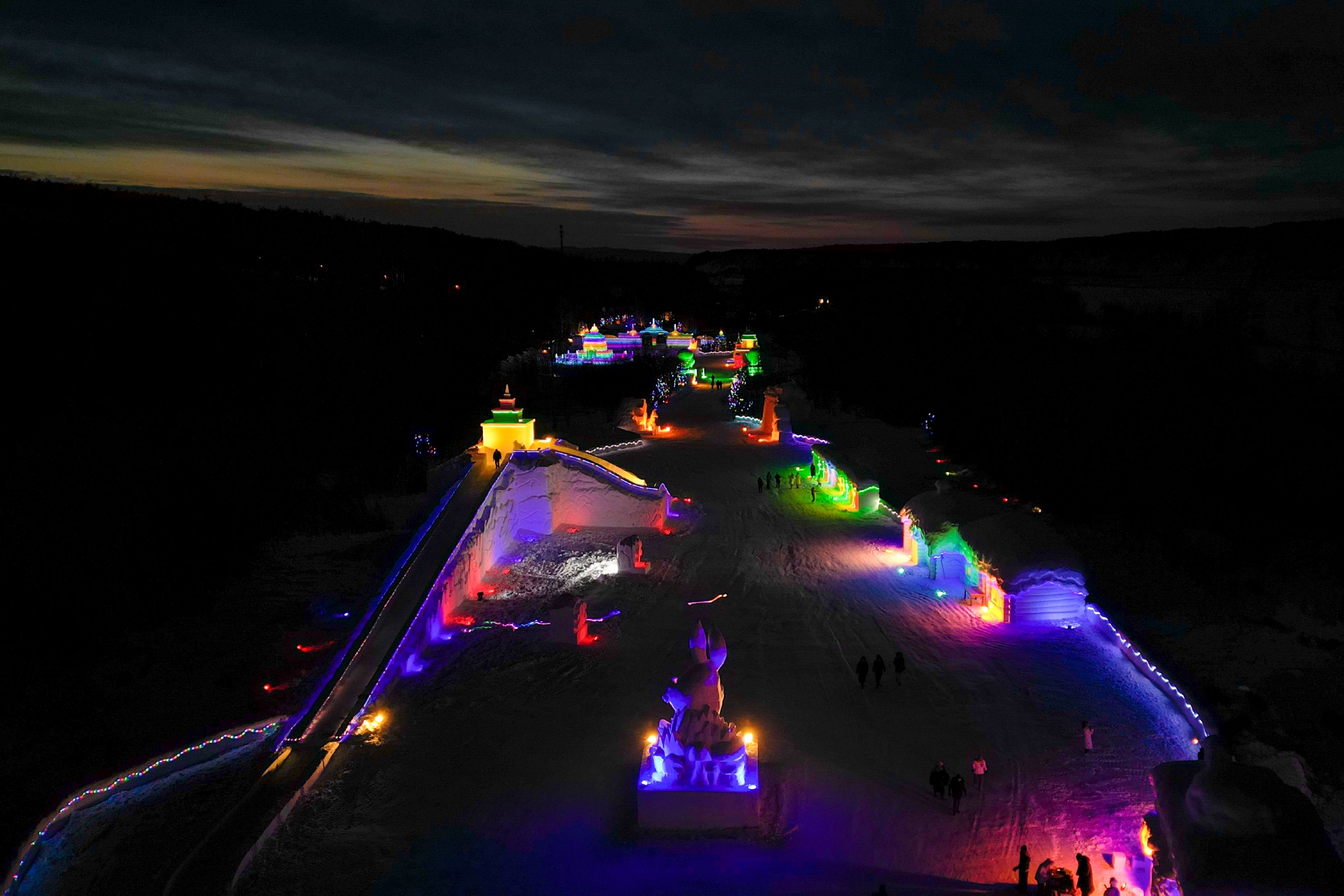 这是1月7日拍摄的漠河市北极村冰雪童话世界夜景(无人机照片)。新华社记者 张涛 摄