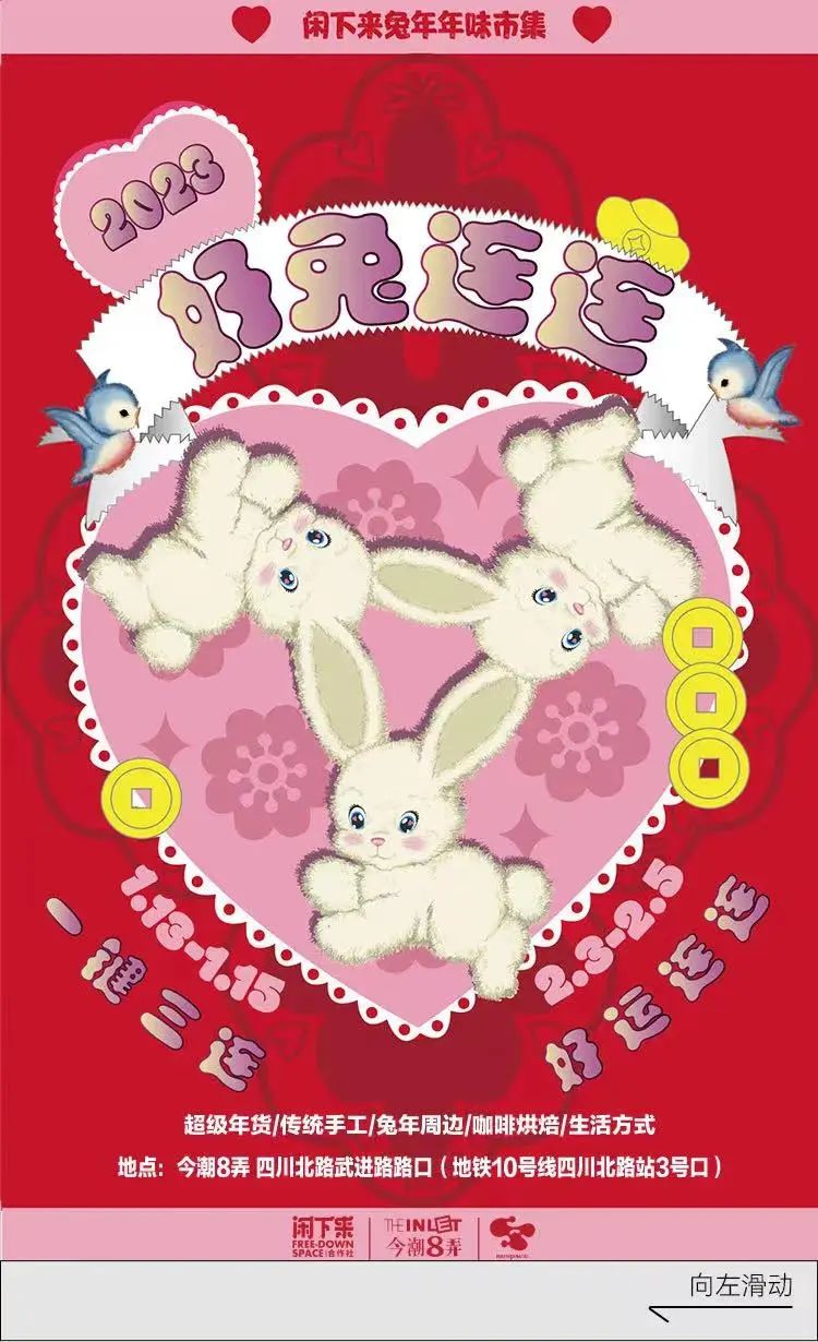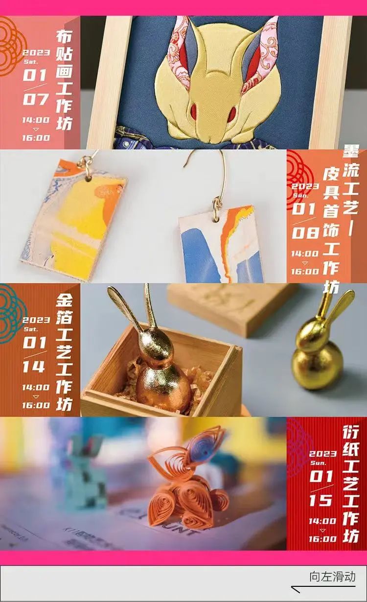 精彩活动预告(图源:今潮8弄)除了共赏“喜迎新春展新颜”的“潮兔春禧”新春灯会外,在春节期间,一系列传统与新潮交相辉映的沉浸式年味游玩体验也将接踵而至。不仅有“飞花接福”新春限时对诗活动,还有传统非遗与国潮韵味相结合的海派年俗文创集市,此外,更有彰显非遗技艺魅力的“中式新生活工作坊”等社区活动,让人们度过一个“闹忙”的海派春节。
