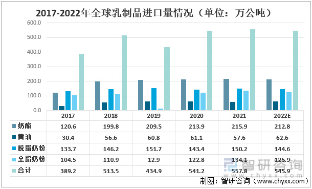2017-2022年全球乳制品进口量情况(单位:万公吨)