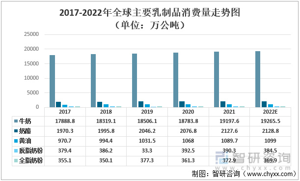 2017-2022年全球主要乳制品消费量走势图(单位:万公吨)