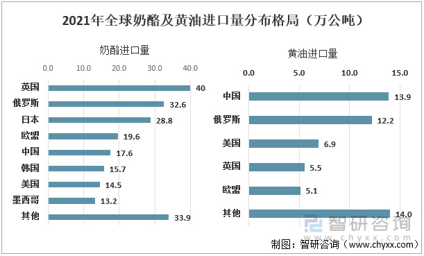 2021年全球奶酪进口量最多的国家分别是英国、俄罗斯、日本和欧盟,依次占全球奶酪进口量的18.53%、15.1%、13.34%、.08%;2021年全球黄油进口量最多的国家分别是中国、俄罗斯、美国,依次占全球黄油进口量的24.13%、21.18%、11.98%。