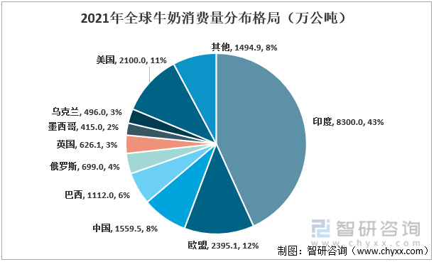 据统计,2021年全球牛奶消费量最多的国家分别是印度、欧盟、美国、中国,依次占全球牛奶消费量的43%、12%、11%、8%。
