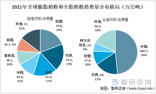 2021年全球脱脂奶粉及全脂奶粉消费量分布格局(万公吨)
