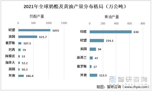 2021年全球奶酪产量最多的国家分别是欧盟、美国、俄罗斯、巴西,依次占全球奶酪产量的47.84%、28.19%、4.88%、3.58%;2021年全球黄油产量最多的国家分别是印度、欧盟、美国,依次占全球黄油产量的55.97%、19.02%、8.35%。