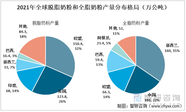 2021年全球脱脂奶粉及全脂奶粉产量分布格局(万公吨)