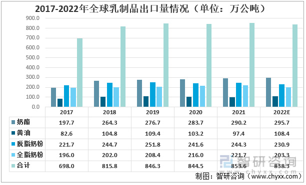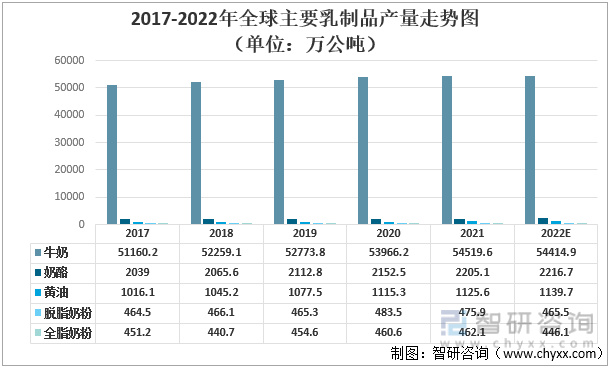 2017-2022年全球主要乳制品产量走势图(单位:万公吨)