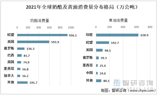 2021年全球奶酪消费量最多的国家分别是欧盟、美国、俄罗斯、巴西,依次占全球奶酪消费量的44%、27.91%、6.41%、3.84%;2021年全球黄油消费量最多的国家分别是印度、欧盟、美国,依次占全球黄油消费量的57.71%、8.97%、7.68%。