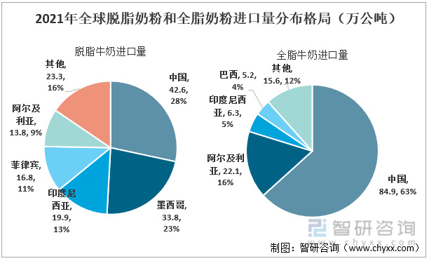 2021年全球脱脂奶粉进口量最多的国家分别是中国、墨西哥、印度尼西亚、菲律宾,依次占全球脱脂奶粉进口量的28%、23%、13%、11%;2021年全球全脂奶粉进口量最多的国家分别是中国、阿尔及利亚、印度尼西亚、巴西,依次占全球全脂奶粉进口量的63%、16%、5%、4%。