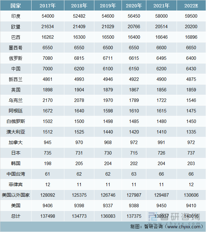 根据美国农业部数据显示,2021年全球奶牛存栏量为1.39亿头,主要集中在印度、欧盟、巴西、墨西哥、俄罗斯等国家或地区。预计2022年全球奶牛存栏量为1.4亿头。