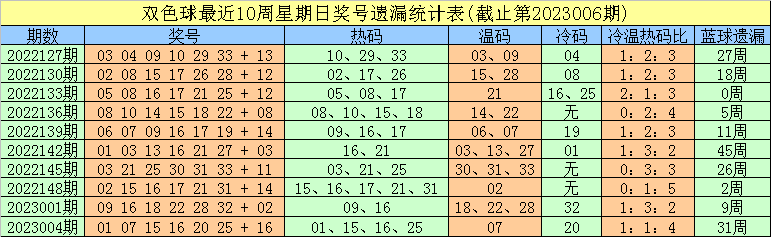 开奖回顾:双色球第2023004期期(上周星期日)奖号为01 07 15 16 20 25 + 16,其中红球号码遗漏期数分别为:3周、4周、1周、0周、12周、2周,遗漏总期数为22周,号码冷温热比为1:1:4,蓝球号码遗漏31周。