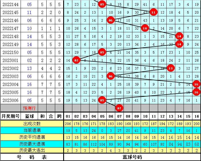蓝球号码:最近30周星期日蓝球冷温热码个数比为14:7:9,最近10周星期日蓝球冷温热码个数比为6:2:2,本周星期日注意冷码蓝球解冻,参考蓝球号码07。