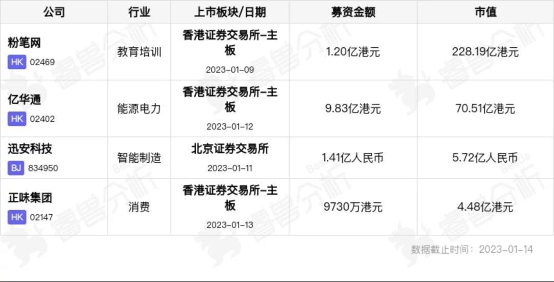 数据来源:睿兽分析本周国内IPO公司统计本周重点监测到国内上市公司共4家。分别位于港交所、北交所。最新市值最高为「粉笔网」228.19亿元人民币。4家上市公司中,有3家曾获得VC/PE或CVC投资。「粉笔网」是中国领先的非学历职业教育培训服务商。课程服务涵盖所有主要职业考试科目,包括公职人员考试、事业单位考试等,根据弗若斯特沙利文报告,于2021年按收入计,粉笔在中国职业考试培训行业排名第二,市场份额4.3%。曾获IDG资本、CPE源峰、弘毅投资、挚信资本、腾讯投资、经纬创投、高瓴资本等投资。「亿华通」在港交所主板上市交易,成为“氢能A+H第一股”,公司是中国领先的燃料电池系统制造商,主要为客车及货车等商用车设计、研发、制造燃料电池系统包括核心零部件燃料电池电堆,公司与北汽福田、宇通客车、吉利商用车等国内商用车制造商建立了稳固的长期合作关系,曾获得水木创投、水木易德投资、宇通汽车、东旭光电、清华大学教育基金会、华德资本、国泰君安创投、光大瑞华、君盛投资、天创资本、中信证券、新鼎资本、春阳资本、琨玉资本等机构投资。职业教育考试服务平台「粉笔」曾获得IDG资本、CPE源峰、挚信资本、DST Global、经纬创投、腾讯投资、高瓴资本、景林投资、华兴新经济基金等投资。