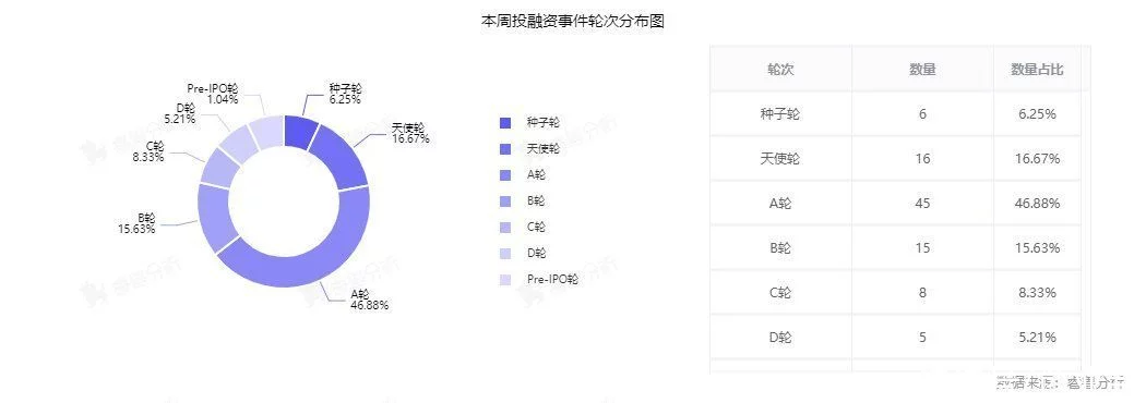 数据来源:睿兽分析本周国内投融资事件阶段分布从本周披露获投企业的阶段分布来看,事件主要集中在A轮、天使轮和B轮,分别为A轮45个,天使轮16个,B轮15个。
