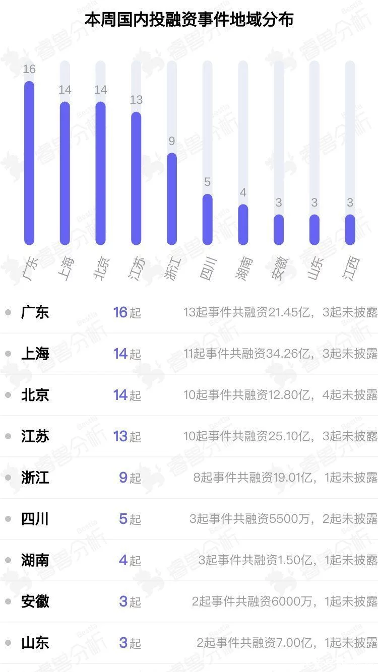 本周国内投融资事件地域分布从本周披露获投企业的地域分布来看,主要集中在广东、上海、北京、江苏。其中广东披露16个,上海和北京均披露14个,江苏披露13个。