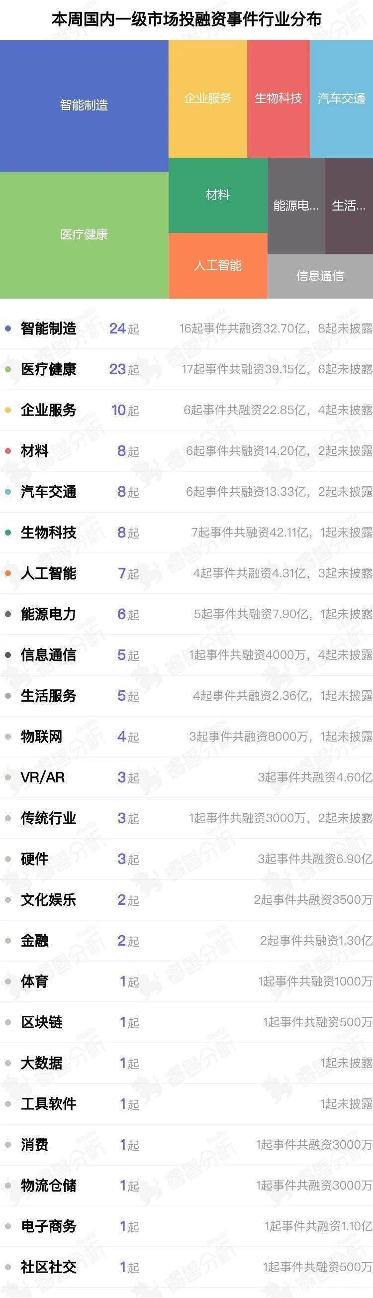 全球投融资周报睿兽分析每周整理当周最值得关注的国内外热门投融资事件,帮助大家及时了解全球市场动向。本周(01.07-01.13)全球投融资概览根据睿兽分析监测数据,本周国内一级市场披露的融资事件96起,其中已披露融资金额的事件70起,总规模141.22亿元人民币。本周国内投融资事件行业分布从融资案例数量来看,本周智能制造、医疗健康、企业服务领域融资最活跃,分别为24个、23个、10个。从已披露金额事件的融资规模来看,生物科技领域最高,融资总规模约为42.11亿元人民币,其中生物医药创新研发中心「飞镖加速器ATLATL」获数亿美元A轮融资。「飞镖加速器ATLATL」通过整合生物医药研发的共性要素,提高资源利用率,将传统的重资产投资模式转变为轻资产。本轮融资由高瓴独家投资,同时,双方将以ATLATL为平台,共同启动 Aseed+首航计划,计划未来五年内支持50个前沿生命科学创新项目的概念验证及落地孵化。其次是医疗健康已披露融资总额为39.15亿元人民币,其中创新型生物制药企业「博锐生物」完成超15.00亿元人民币A轮融资。博锐生物聚焦于免疫领域,自身免疫以协同科室全覆盖为布局主线,肿瘤免疫以细胞类型覆盖为靶点布局主线。本轮融资是继2019年9月太盟投资集团完成并购重组并获得控制权之后,博锐生物首次对外融资,投资人包括国际主权基金及多家地方产业基金。