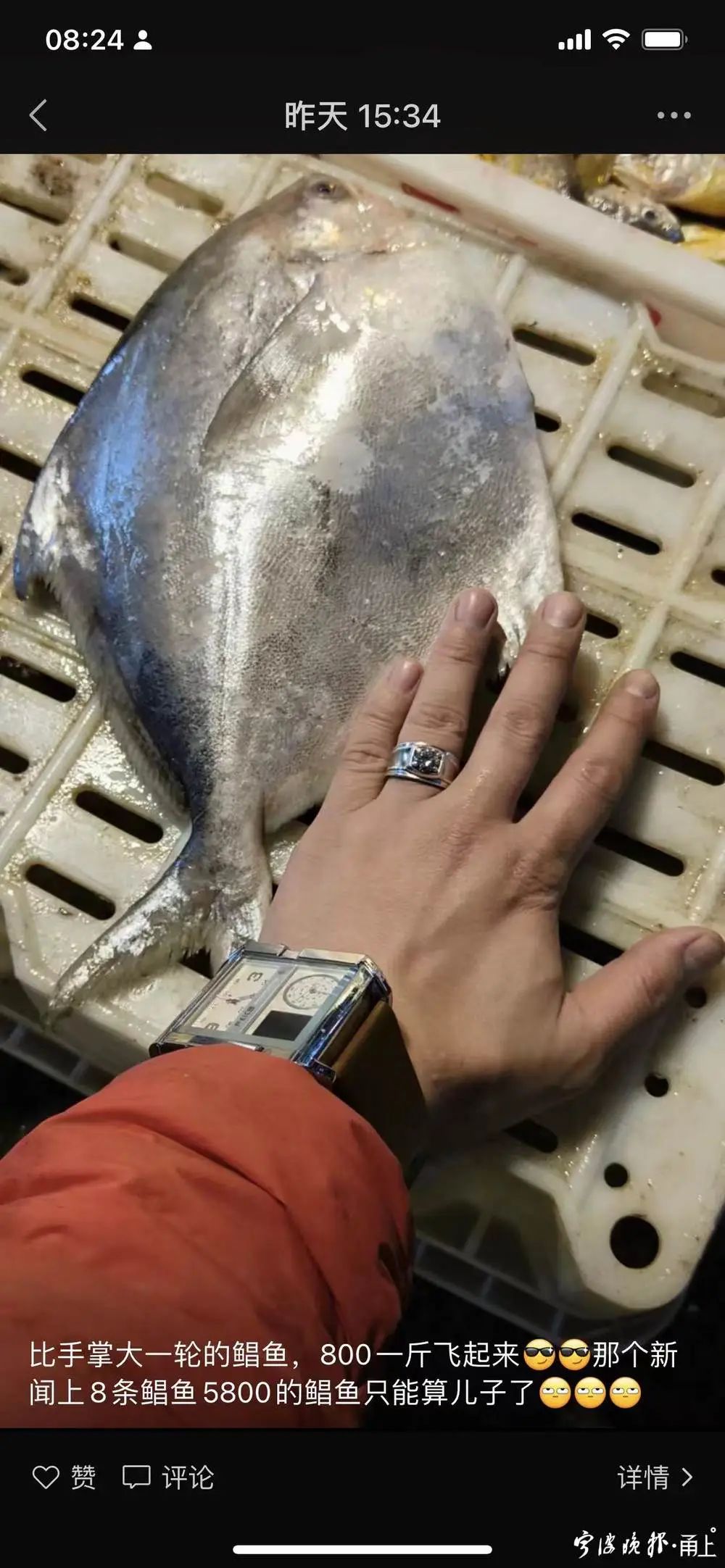 宁波海鲜商贩晒出的鲳鱼信息“除因年节需求大增外,今年出海捕捞量减少也是涨价的主要原因之一。”宁波水产品批发市场的相关负责人分析说,条重一斤左右的东海野生大鲳鱼本来捕捞量就不高,今年的捕捞量特别少,经常出现“供不应求”“断货”的情况。