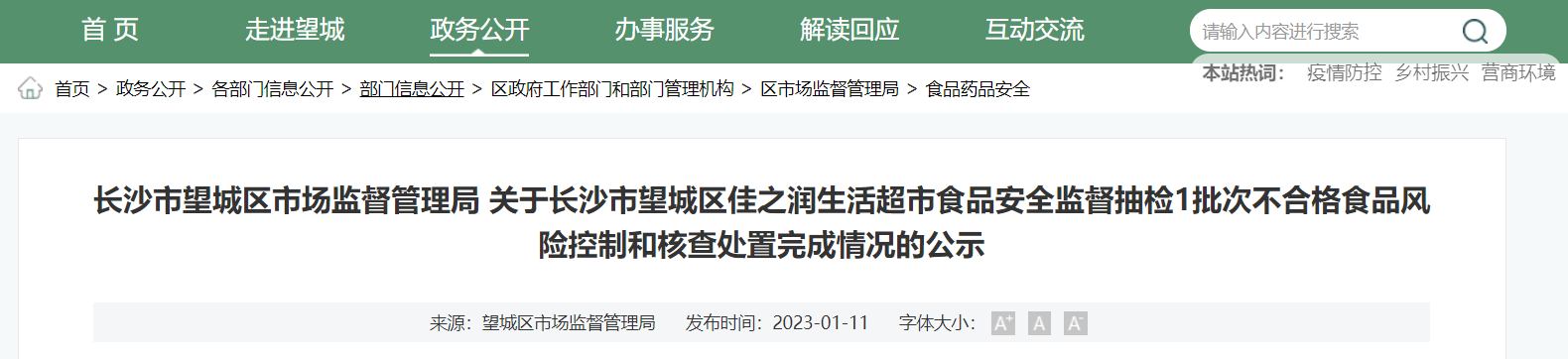 关于长沙市望城区佳之润生活超市1批次不合格食品风险控制和核查处置完成情况的公示