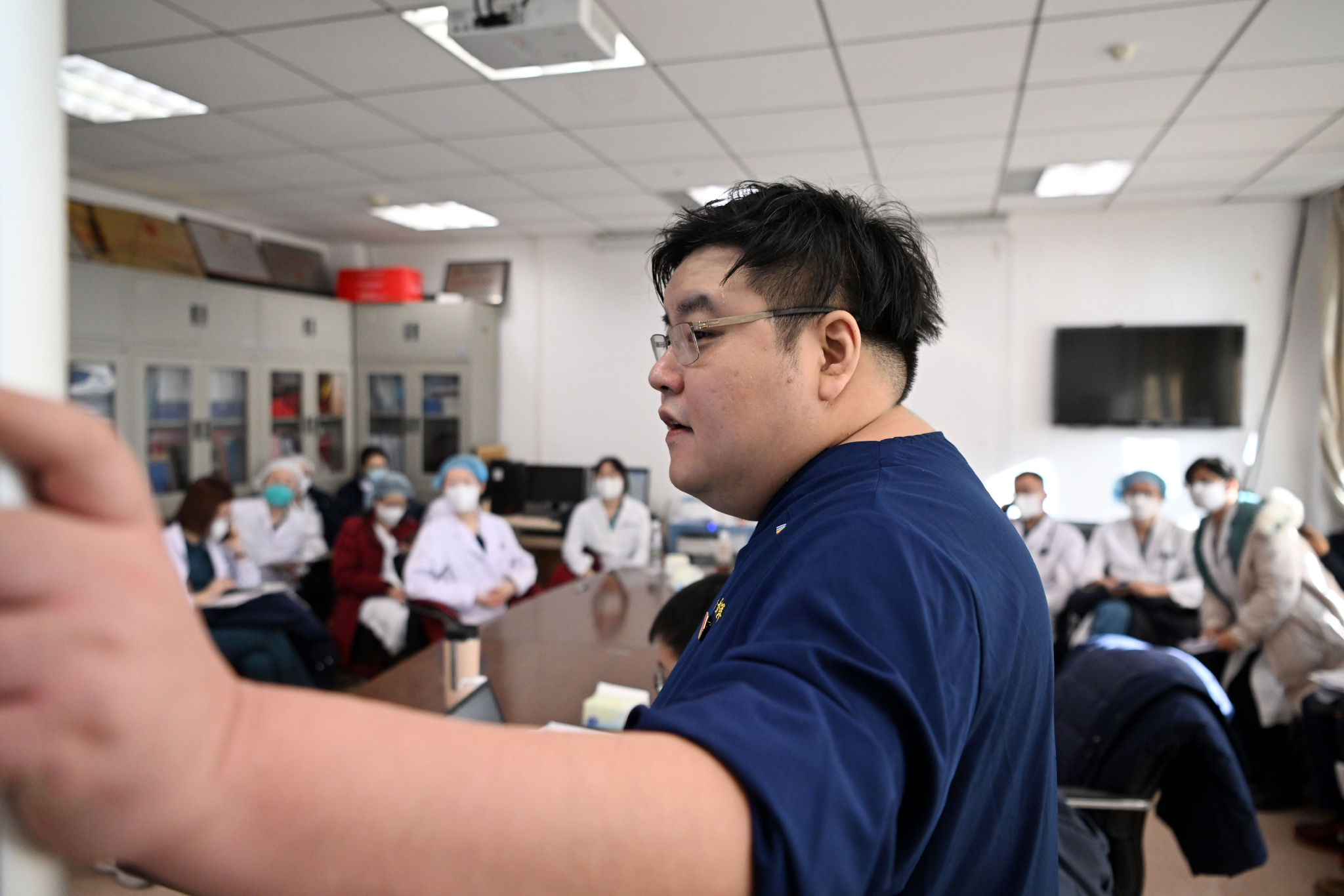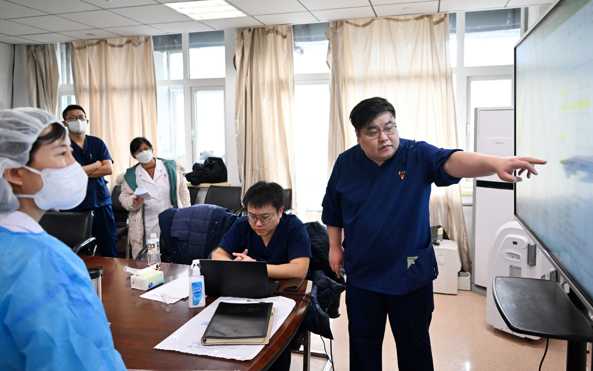 刘洋(右)在天津医科大学总医院主持急诊分流救治专班调度会(1月17日摄)。新华社记者 李然 摄