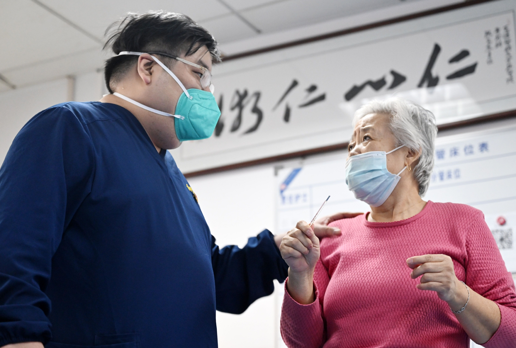 在天津医科大学总医院,刘洋(左)和一位老人交流(1月18日摄)。新华社记者 李然 摄