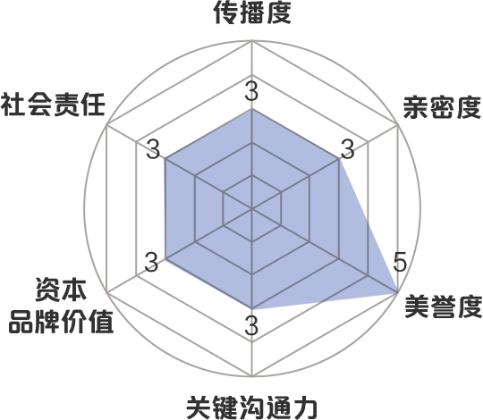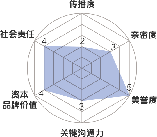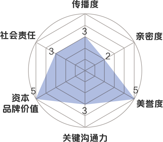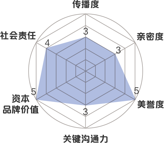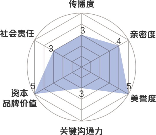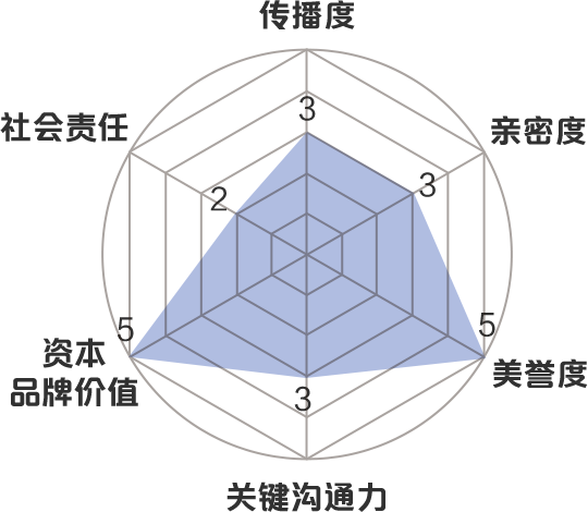 新浪财经品牌价值模型:传播度3分,亲密度4分,美誉度5分,关键沟通力3分,资本品牌价值5分,社会责任3分