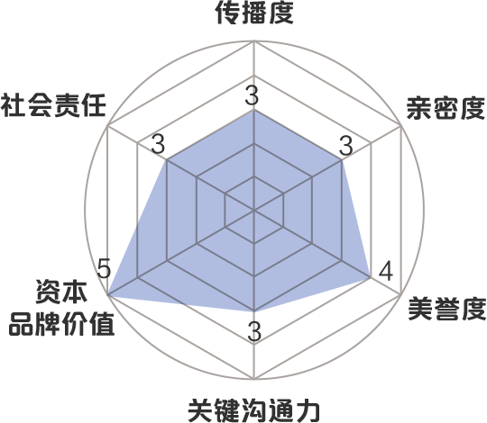 新浪财经品牌价值模型:传播度3分,亲密度3分,美誉度5分,关键沟通力3分,资本品牌价值5分,社会责任4分