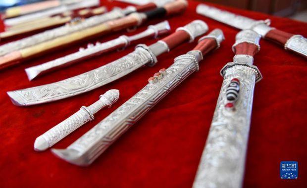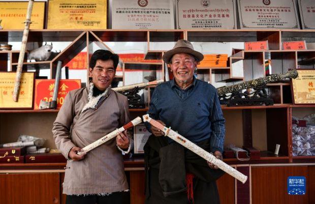 普达瓦(右)和儿子多吉占堆一起展示制作好的拉孜藏刀(1月19日摄)。 西藏日喀则市拉孜镇拉孜村村民普达瓦是西藏自治区级非物质文化遗产拉孜藏刀制作技艺代表性传承人,也是家族第六代藏刀制作技艺传承人。 普达瓦制造的藏刀,从刀鞘的制坯、刻花、上色,到刀刃的锻造、打磨、抛光等,全部工序均为纯手工制作。他的儿子多吉占堆子承父业,成为了日喀则市级拉孜藏刀制作技艺非遗传人。 2018年,父子俩成立合作社,先后招收包括贫困户在内的18名学徒,传承藏刀制作技艺,共同“锻造”富裕生活。 新华社记者 晋美多吉 摄