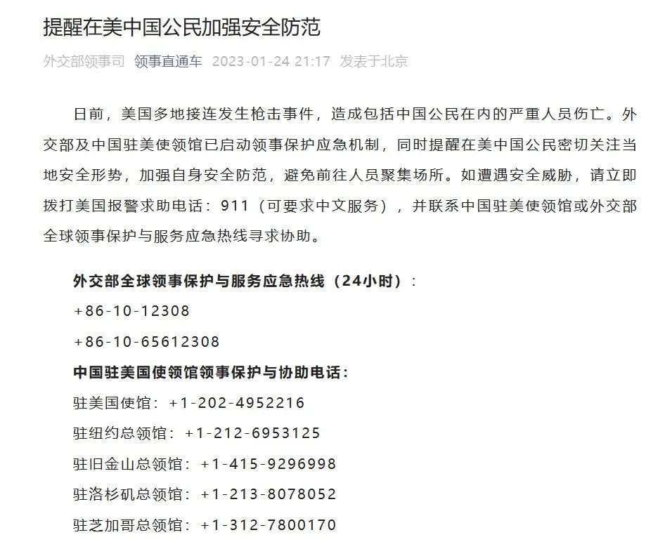 日前,美国多地接连发生枪击事件,造成包括中国公民在内的严重人员伤亡。外交部及中国驻美使领馆已启动领事保护应急机制,同时提醒在美中国公民密切关注当地安全形势,加强自身安全防范,避免前往人员聚集场所。如遭遇安全威胁,请立即拨打美国报警求助电话:911(可要求中文服务),并联系中国驻美使领馆或外交部全球领事保护与服务应急热线寻求协助。