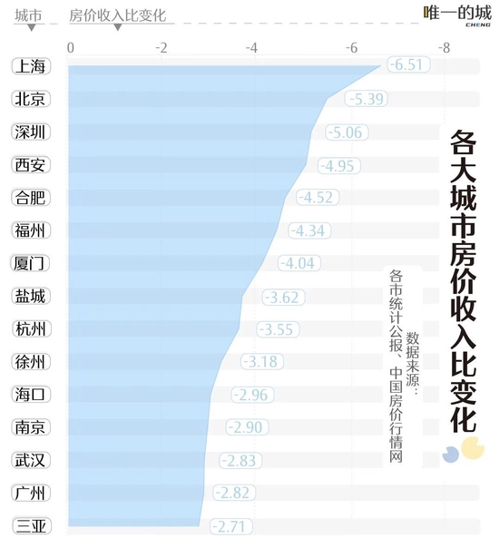 这样的变化在一线城市中的表现最为显著。房价收入比变化最大的城市是上海、北京和厦门,分别降低了6.51、5.39、5.06,这意味着2021年在这三座城市买一所宜居的住宅要比在2020年买少花费几年的收入。