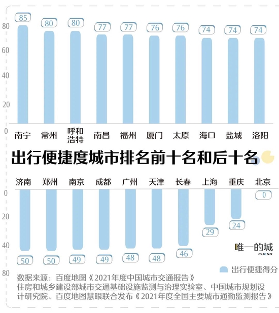研究结果显示出行便捷度高的城市,依旧出现在了老牌工业强市与部分中西部城市之中。其中,南宁、常州、呼和浩特“包揽”前三,南昌、福州、厦门紧随其后。
