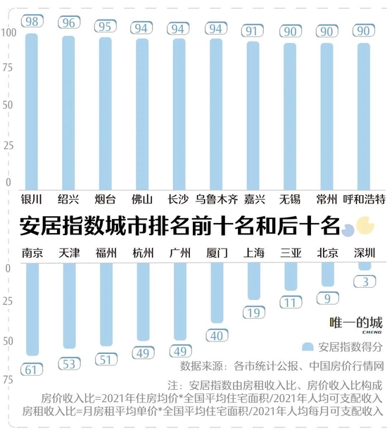 安居指数聚焦“住房难”的问题,运用房租收入比和房价收入比两项数据,衡量不同城市的住房压力。