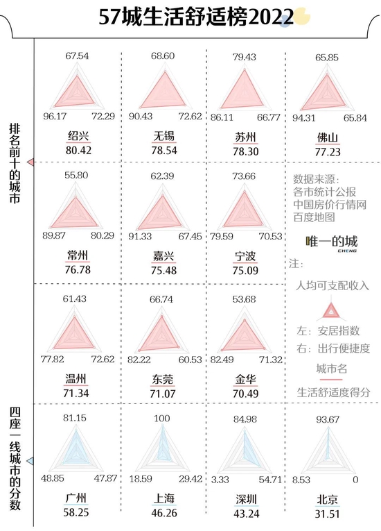 南方周末城市(区域)研究中心尝试运用量化模型,从安居指数、出行便捷度和收入三大维度出发,构建《57城生活舒适榜2022》,呈现中国不同城市的舒适度。