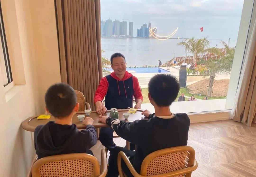 在市区妈屿岛的一间民宿,游客围坐在草坪区品茶,还有的游客拍照留念,人气很热闹。来自顺德的陈先生,这次是和朋友3家人十多个人一起自驾游来汕头过春节。拥有绝佳视野的海景房满足了他们感受汕头滨海风光的需求。而同行队伍中的两名中学生则喜欢上这间有上下铺的房间。