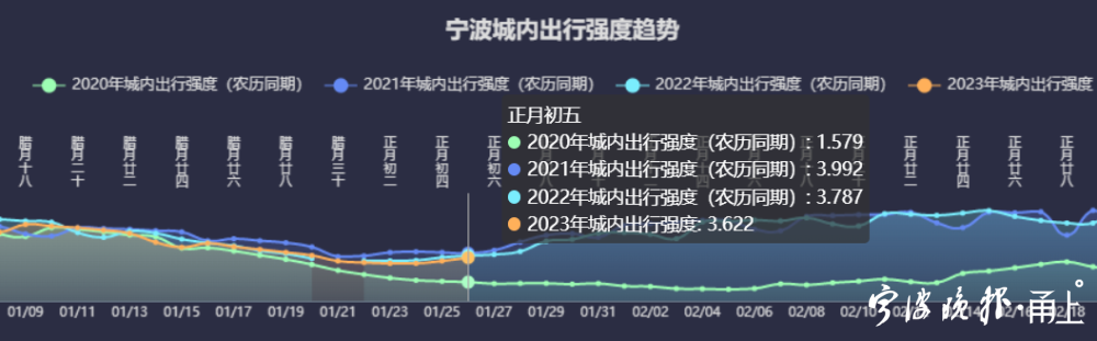 百度迁徙大数据通过“城内出行强度”,衡量该城市有出行的人数与该城市居住人口比值。2023年春节期间,宁波的城内出行强度与2022年基本持平,却明显低于2021年的水准。如正月初五,2023年的城内出行强度较2021年低27.6%。