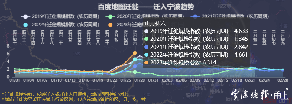 值得一提的是,和2019年相比,2023年春节小长假前三天的迁入规模稍有下滑,但正月初四以来出现“反转”。2023年宁波的迁入规模指数,均超过2019年农历同期,其中正月初六更是超出36.3%——