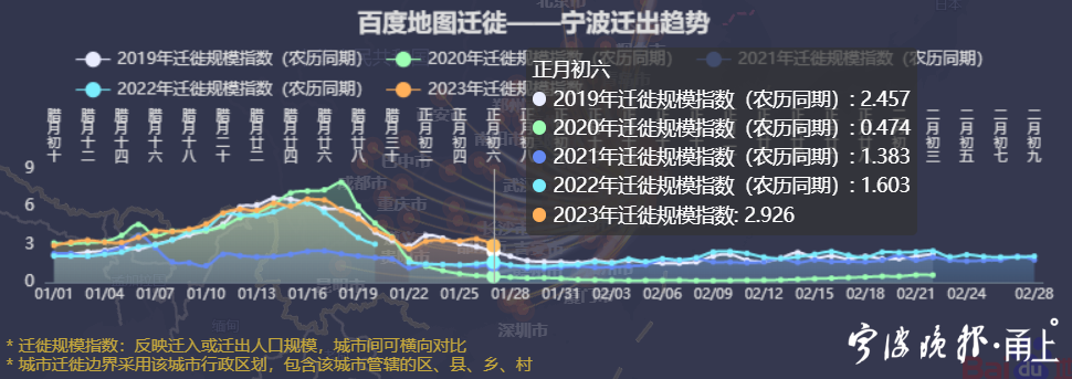 从迁出规模看,宁波市民“走出去”的热情高涨。除了阖家团圆的腊月三十,2023年宁波的迁出规模指数均保持在3点以上,与疫情前的2019年旗鼓相当,为2021年和2022年的2倍左右。