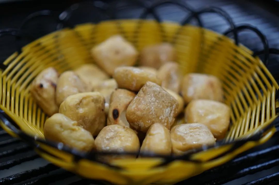 一人一马扎,围着铁屉坐下,老板将装着沾料的小碟递过来,然后就可以吃了。刚从火上取下来的小豆腐金黄焦脆,外酥里韧,沾上料汁咬开,但见中间蜂窝眼吸饱汁液,,料碟里装着小米辣,青蒜沫,腐乳汁,甜酱油,干果碎等,配着小豆腐吃下去心满意足。
