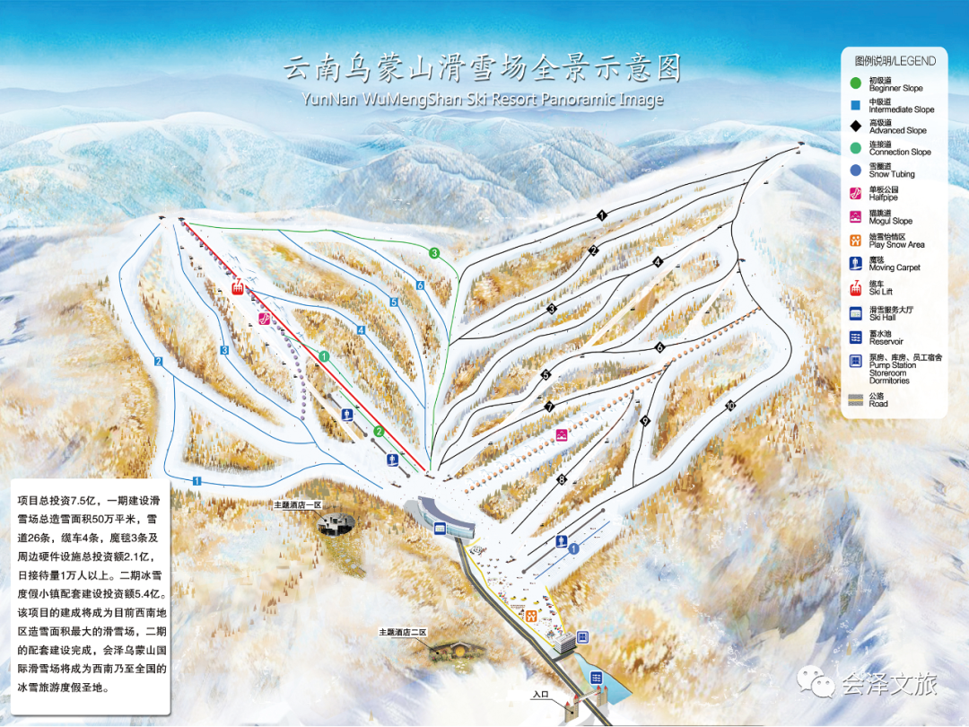 会泽大海草山国际滑雪度假区是目前我国西南地区雪期较长、雪质良好、规模庞大的滑雪圣地之一。目前拥有初级雪道3条、中级雪道1条、高级雪道2条,以及雪圈道、高山缆车、魔毯等玩乐设施。