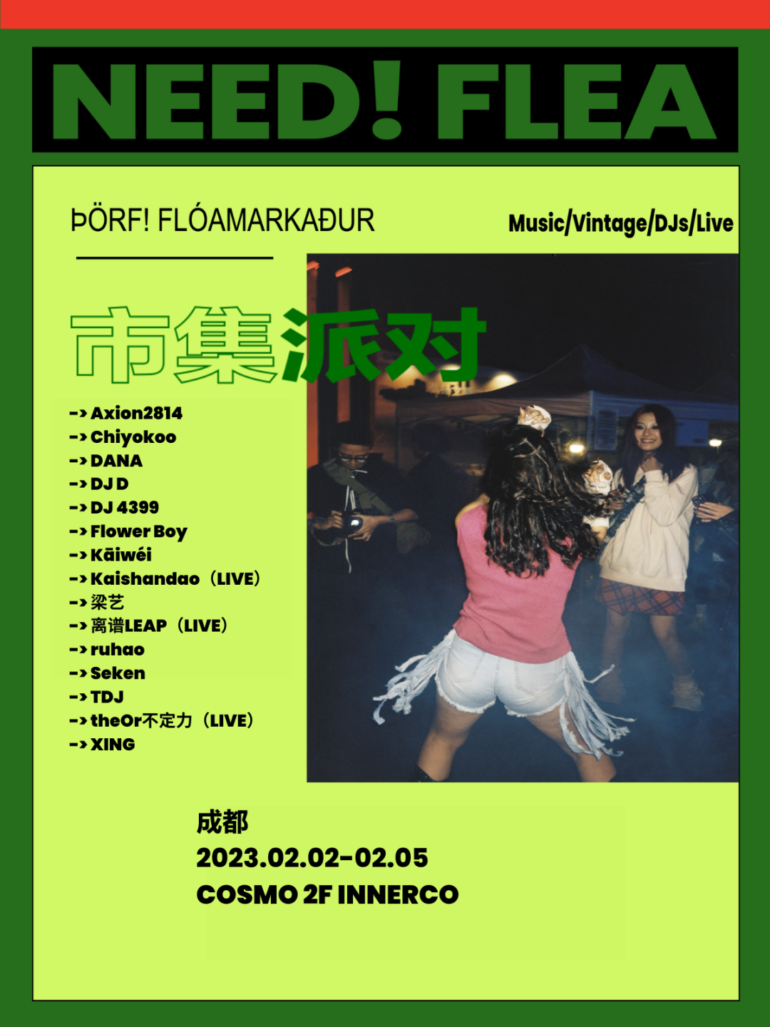 78位来自五湖四海的摊主纷至沓来带着新品和新年能量来到成都!15位NEED! FLEA新老DJ朋友和乐队朋友将在四天的活动不间断带来多元的高质量音乐,我们还将在舞台中加入传统堂会演出,一起来NEED! 逛,跳舞,认识朋友,吃元宵!